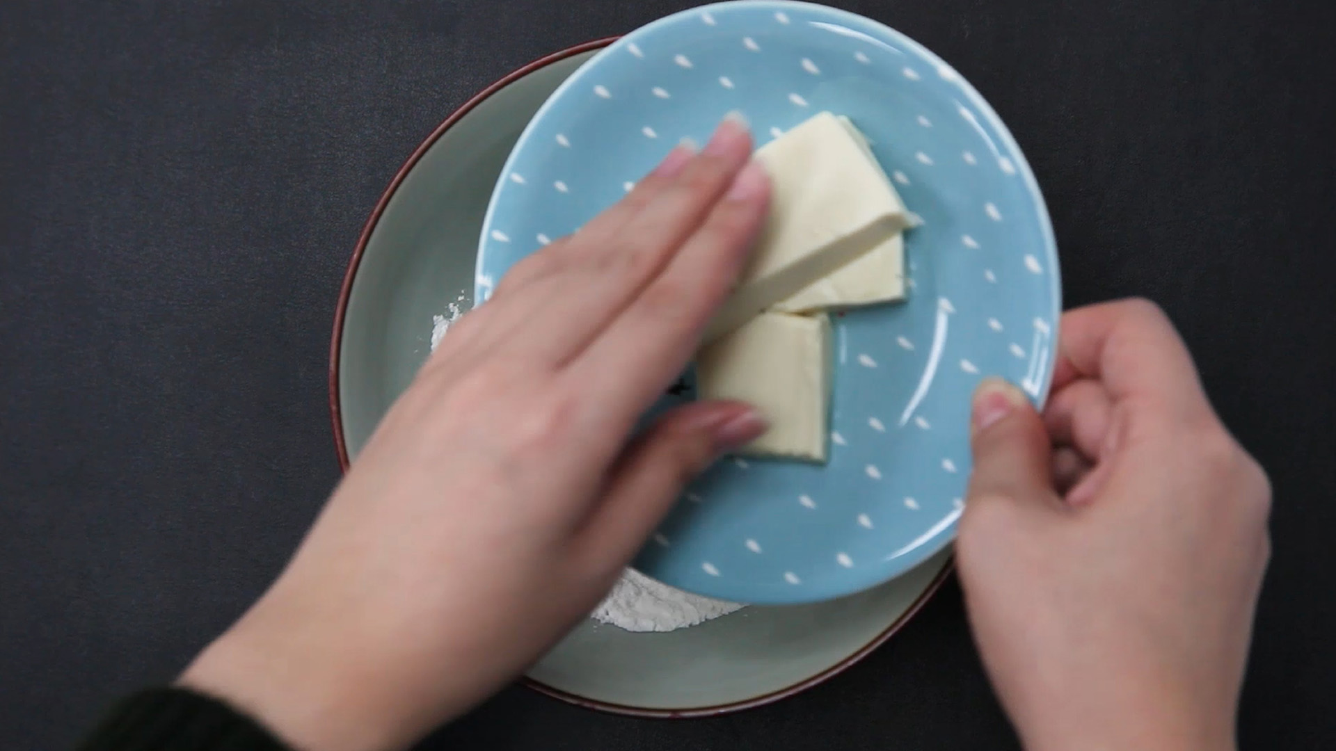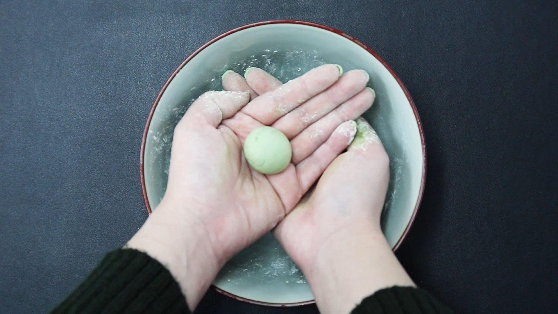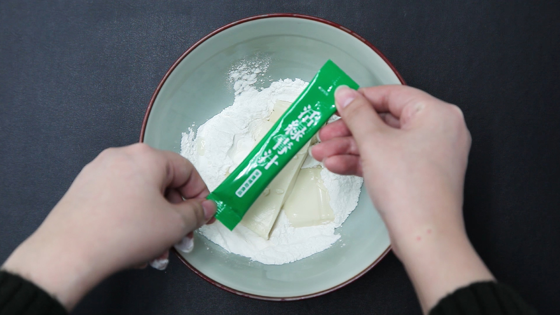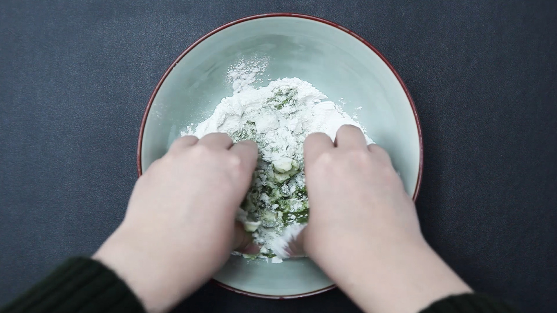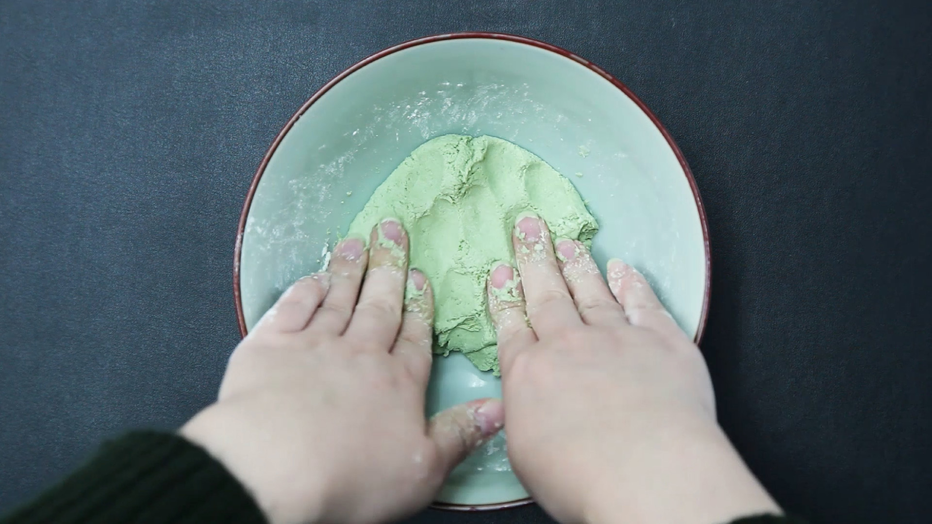 開始搓揉混合糯米粉、嫩豆腐及青汁