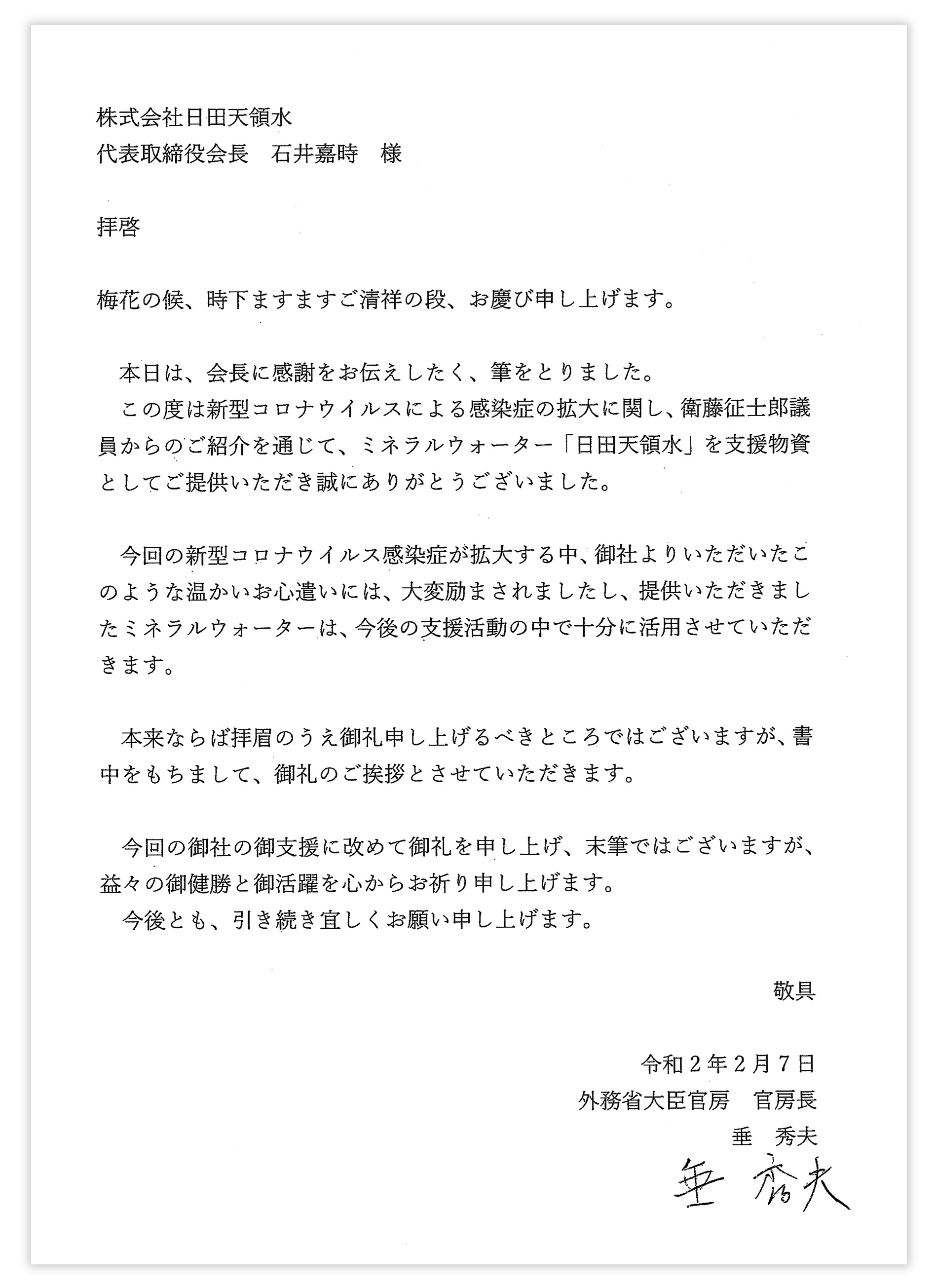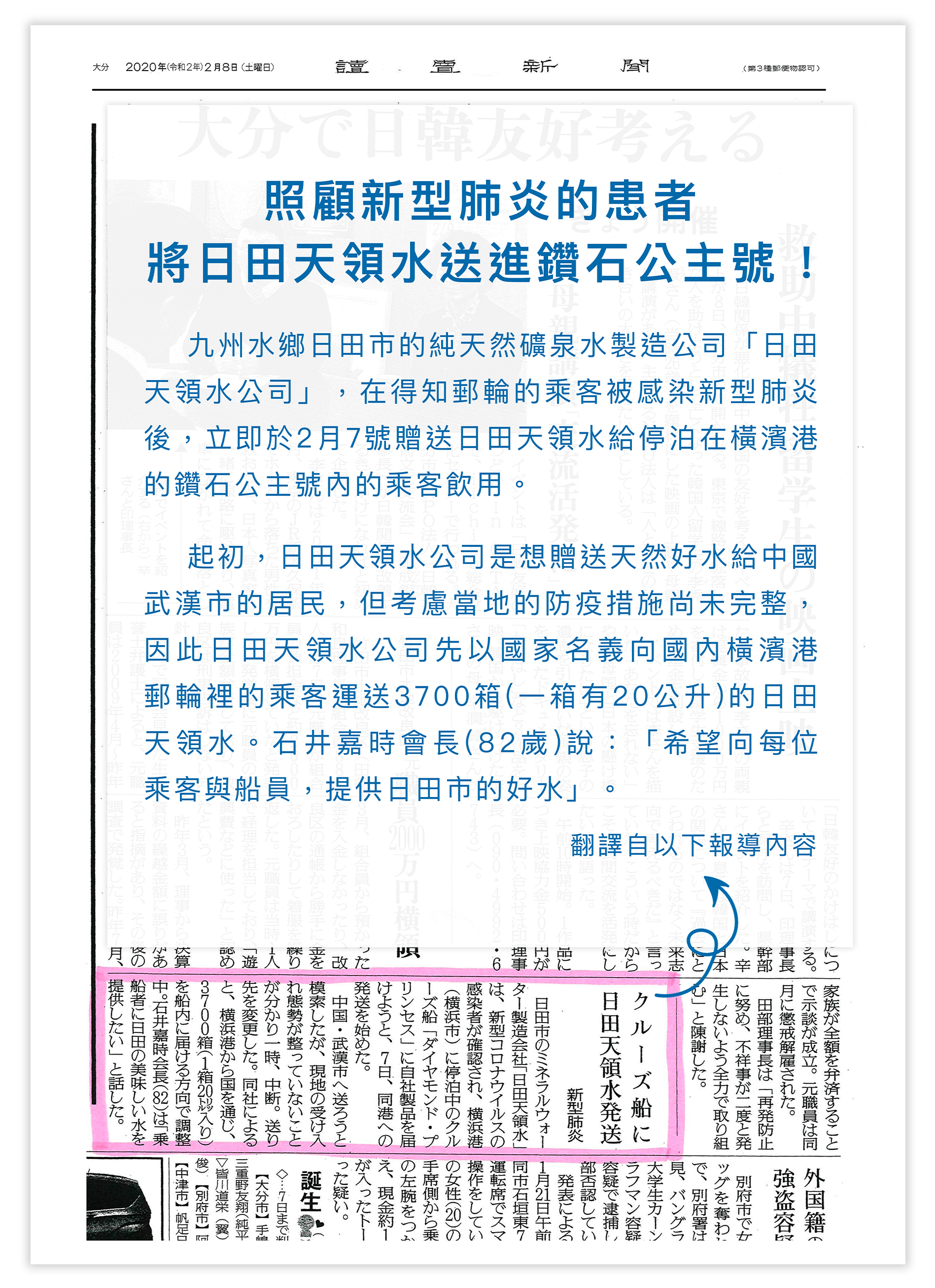 日田天領水長年的企業理念是”從日本開始為世界提供健康的資源”,為實踐此企業理念我們向2月停泊在橫濱港的鑽石公主號裡的每位乘客與船員們免費提供數千箱20L的日田天領水,也向其他確診新型肺炎的每位患者免費提供日田天領水500ml的48瓶和12L的2箱。希望能夠讓更多人喝到乾淨天然的健康好水。