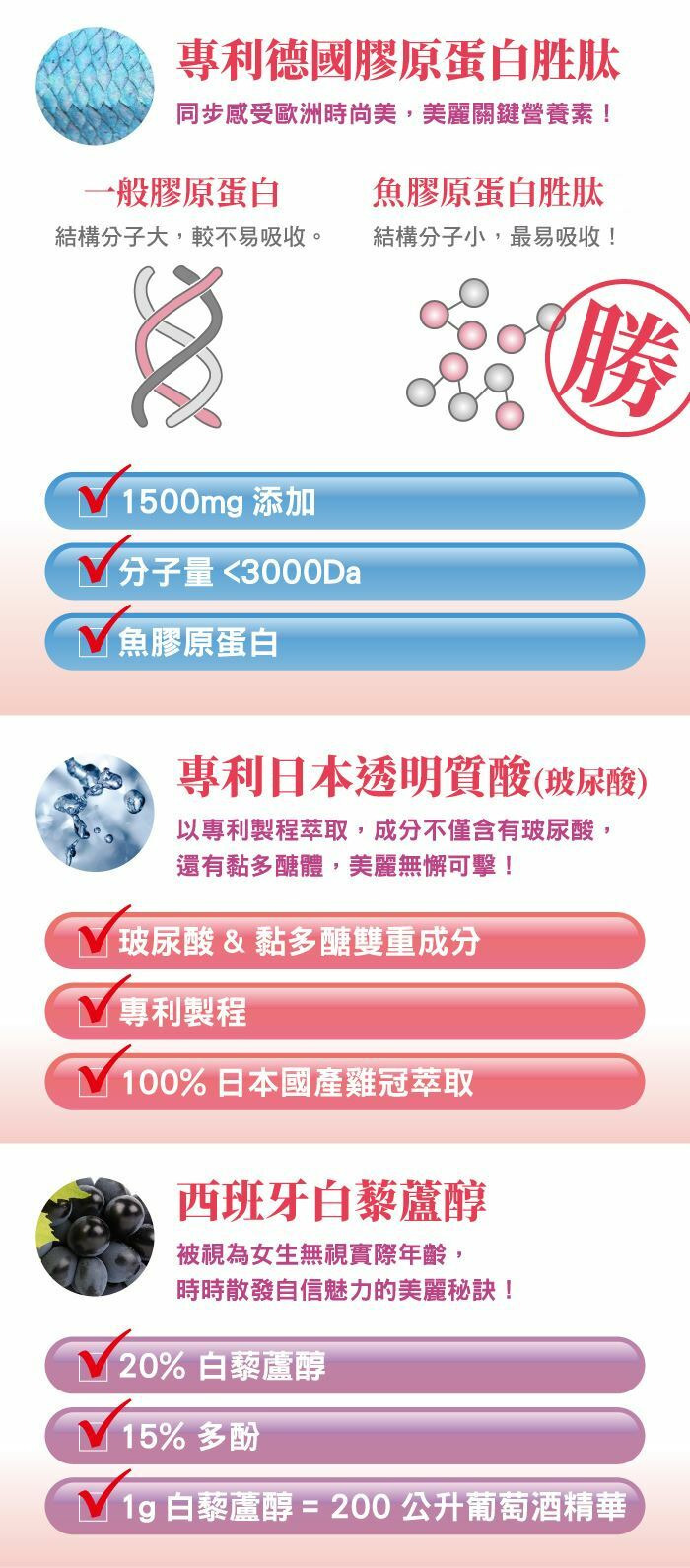 ● 結合專利膠原微胜肽、白藜蘆醇及專利玻尿酸