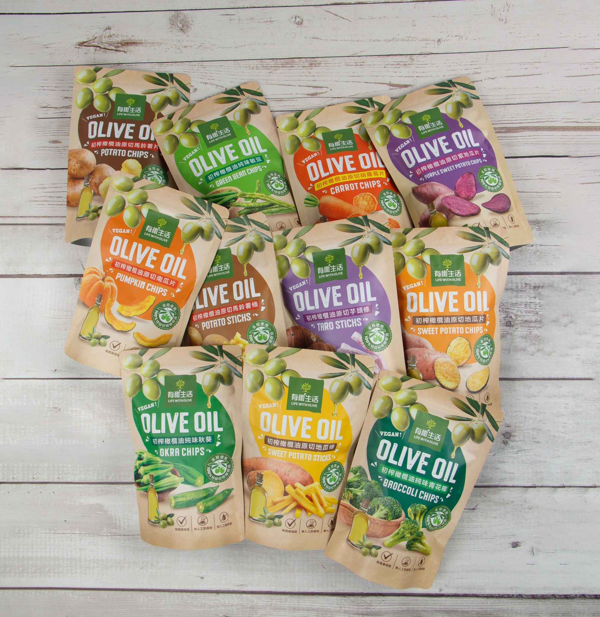 有橄生活蔬菜片,採用 100% 特級初榨橄欖油,以 90°C 低溫真空製成,完整保留蔬菜原色與營養。